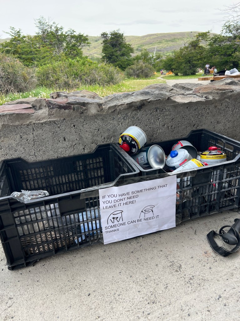 - Don’t bother purchasing a gas canister! Literally go to your hotel/hostel front desk and ask if they have used ones from previous guests. We didn’t use ours, and others we met post-hike didn’t use theirs either. Hikers will leave them at the front desk OR at the trek refugios. At trek refugios, there are ‘take or leave’ crates (see photo below), and you will find a pile of gas canisters at either trek starting point. Alternatively, if you run out of gas after acquiring your *free* one, just hydrate your meals with the boiling water dispenser at the refugios!!